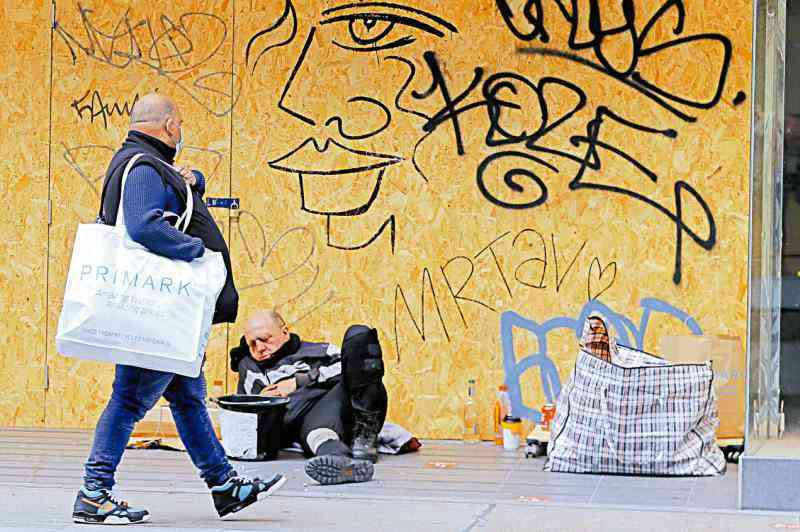 圖:一名倫敦民眾4月路過一名露宿者。\美聯(lián)社