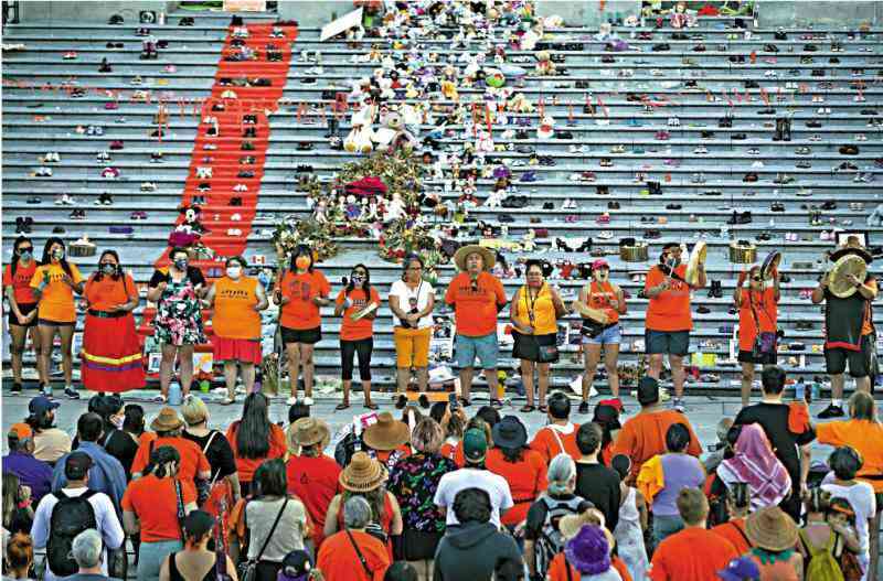 圖:加拿大原住民21日在溫哥華悼念上月發(fā)現(xiàn)遺骸的原住民兒童。\美聯(lián)社