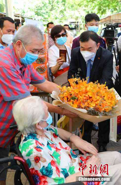 當(dāng)?shù)貢r(shí)間7月2日,中國(guó)駐柬使館一行赴金邊疫苗接種現(xiàn)場(chǎng),看望接種第二劑中國(guó)產(chǎn)新冠疫苗的101歲華裔老人賀琴女士。圖為賀琴女士與中柬相關(guān)代表合影。中新社記者 歐陽(yáng)開宇 攝