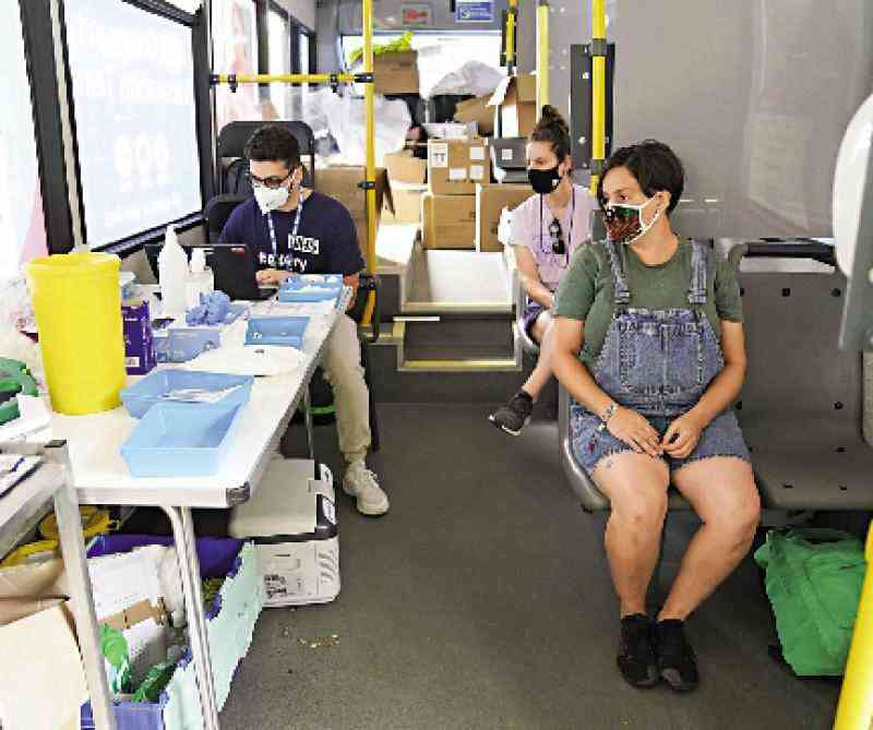 圖:英國民眾23日在“疫苗巴士”上等候打針。/美聯(lián)社