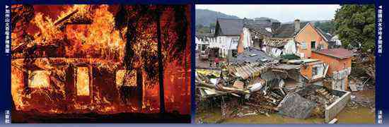 圖:左圖:加州山火吞噬多棟房屋。右圖:德國(guó)洪水沖垮多間民居。\法新社