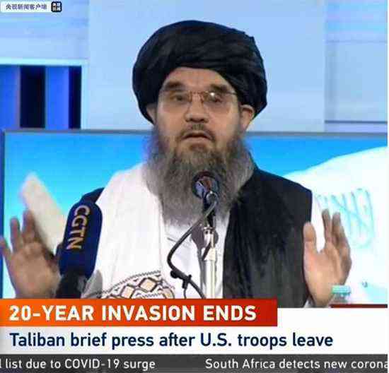 當(dāng)?shù)貢r(shí)間8月31日,中央廣播電視總臺(tái)報(bào)道員帕威斯在喀布爾報(bào)道,塔利班在阿富汗國(guó)家電視臺(tái)舉行新聞發(fā)布會(huì)。