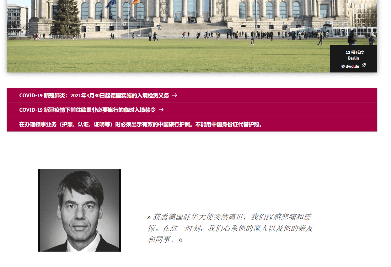 德國駐華大使館網(wǎng)站上也發(fā)出了賀巖去世的消息——“獲悉德國駐華大使突然離世,我們深感悲痛和震驚。在這一時刻,我們心系他的家人以及他的親友和同事。”