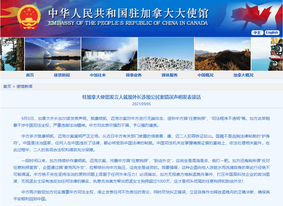 9月5日,加拿大外長加爾諾發(fā)表聲明,就康明凱、邁克爾案對中方進行無端攻擊,誣稱中方搞“任意拘押”、“司法程序不透明”等。加方此舉粗暴干涉中國司法主權,嚴重違背法治精神。中方對此表示強烈不滿,予以強烈譴責。