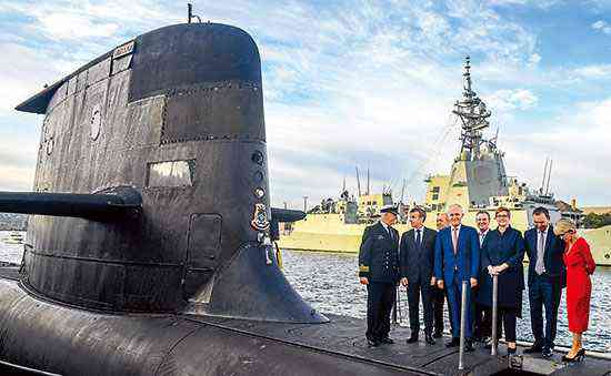 圖:2018年5月2日,法國總統(tǒng)馬克龍(左二)和時(shí)任澳洲總理特恩布爾(左三)站在澳洲潛艇的甲板上。\法新社