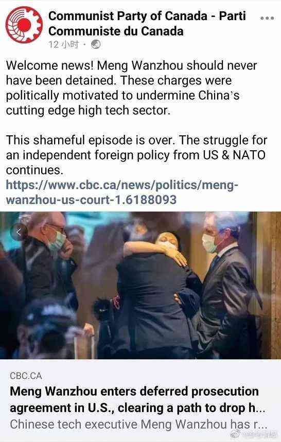 北京時間25日晚,孟晚舟乘坐中國政府包機(jī)回到了祖國的懷抱。在她踏上回家之路的當(dāng)天,加拿大共產(chǎn)黨在推特上發(fā)布了一條消息表示慶祝: