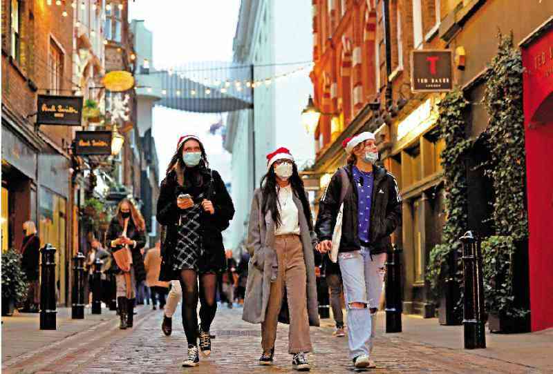 圖:英國疫情極其嚴重,圖為民眾18日頭戴圣誕帽逛街。\法新社