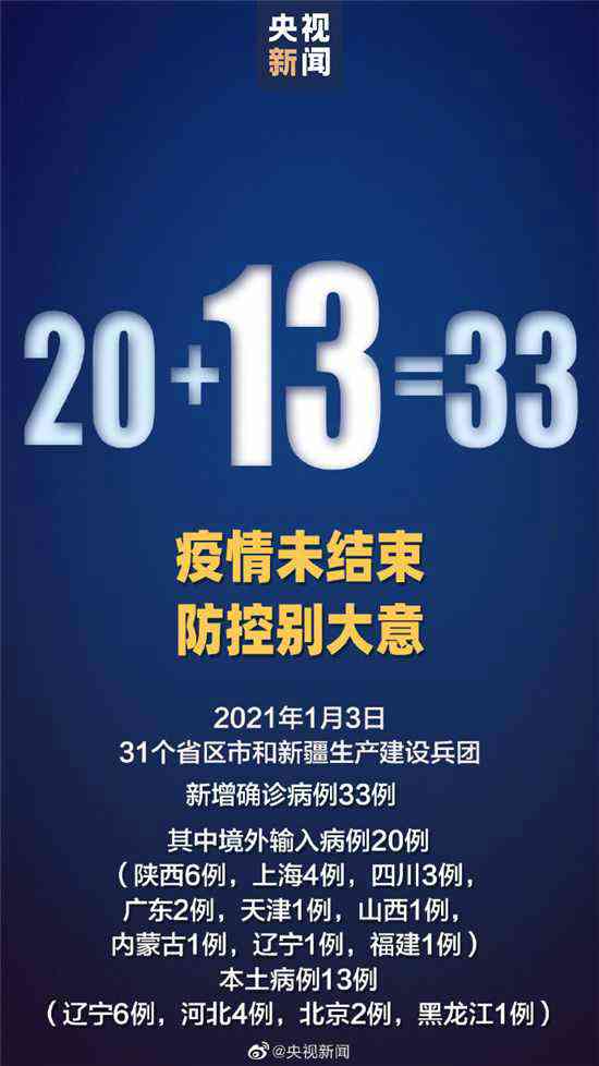 1月3日0—24時(shí),31個(gè)省(自治區(qū)、直轄市)和新疆生產(chǎn)建設(shè)兵團(tuán)報(bào)告新增確診病例33例,其中境外輸入病例20例(陜西6例,上海4例,四川3例,廣東2例,天津1例,山西1例,內(nèi)蒙古1例,遼寧1例,福建1例),本土病例13例(遼寧6例,河北4例,北京2例,黑龍江1例);無新增死亡病例;無新增疑似病例。