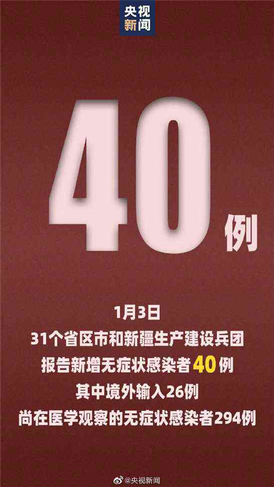 31個(gè)省(自治區(qū)、直轄市)和新疆生產(chǎn)建設(shè)兵團(tuán)報(bào)告新增無癥狀感染者40例(境外輸入26例);當(dāng)日轉(zhuǎn)為確診病例4例(境外輸入3例);當(dāng)日解除醫(yī)學(xué)觀察11例(境外輸入8例);尚在醫(yī)學(xué)觀察無癥狀感染者294例(境外輸入240例)。