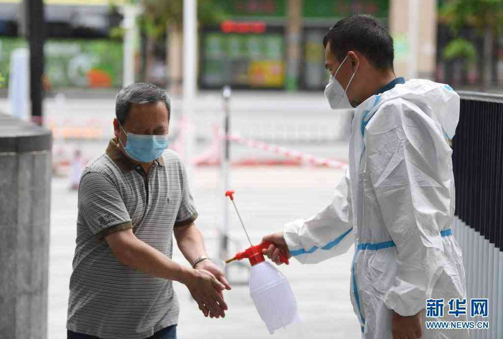 6月12日,在廣州荔灣區(qū)白鶴洞街廣鋼新城一小區(qū),物業(yè)人員給完成核酸檢測(cè)的居民噴灑消毒液。新華社記者 鄧華 攝