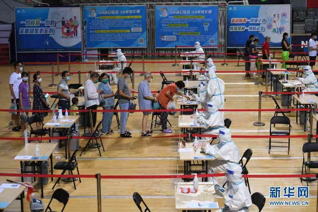 7月25日,市民在南京市鼓樓區(qū)五臺山體育中心體育館內(nèi)登記信息,準備接受核酸檢測取樣。