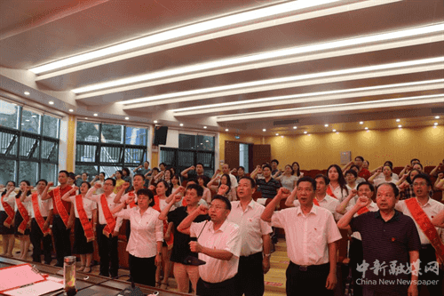 校長郭平貴領(lǐng)誓,全體黨員重溫入黨誓詞