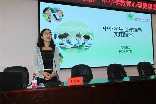 來自北京青年政治學院青年工作學院心理教研室主任于新紅進行《中小學生心理輔導實用技術(shù)》首場輔導報告。(向圣云)