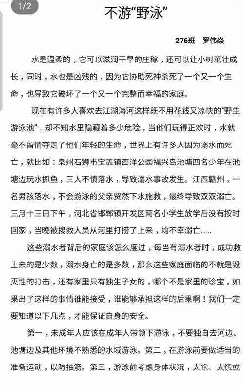 自從活動開展以來,該校3年級至6年級的同學積極參與了本次活動,累計收到征文兩千余篇。他們在班主任的指導下精心準備比賽,通過閱讀大量防溺水安全教育的文章、上網(wǎng)查找防溺水的相關知識,同時結(jié)合身邊的事例,寫出了一篇篇發(fā)自肺腑、發(fā)人深省的征文。