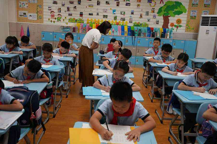 9月1日,上海市第一師范附屬小學(xué),老師指導(dǎo)學(xué)生們完成課后作業(yè)。(中國日報(bào)記者 高爾強(qiáng) 攝)