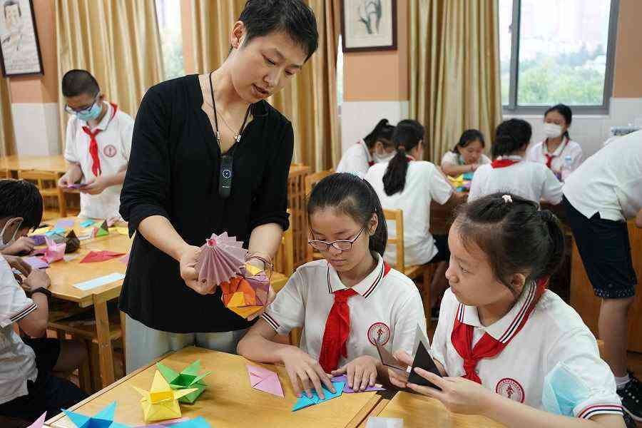 9月1日,上海市進(jìn)才中學(xué)北校,老師指導(dǎo)學(xué)生們學(xué)習(xí)折紙藝術(shù)。(中國日報(bào)記者 高爾強(qiáng) 攝)