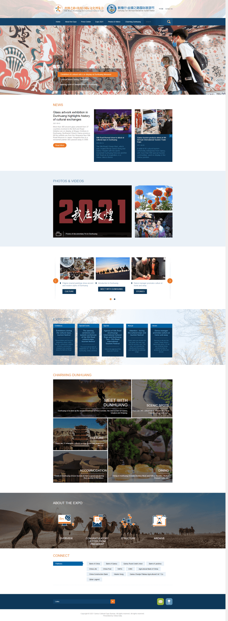 敦煌文博會英文網(wǎng)設(shè)置了“關(guān)于敦煌文博會”、“新聞中心”、“敦煌文博會 2021”、“光影文博會”、“魅力敦煌”等欄目,為海內(nèi)外游客、與會嘉賓、投資者、參展商,以及對敦煌文化感興趣的外籍人士提供實用英文信息服務,展示敦煌的豐厚、優(yōu)質(zhì)的文化旅游資源,進一步提升敦煌及甘肅的國際知名度及影響力。