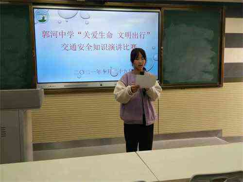 “安全第一,教育先行”。10月29日上午,安徽省廬江縣郭河中學以“關愛生命,文明出行”為主題,組織部分學生在學校電教室,開展了一場中學生交通安全知識演講比賽。