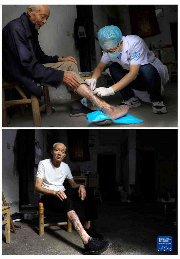 拼版照片:上圖為2020年10月15日,醫(yī)務(wù)人員上門為吳發(fā)貴換藥;下圖為2021年9月3日,吳發(fā)貴在衢州市衢江區(qū)峽川村家中留影。
