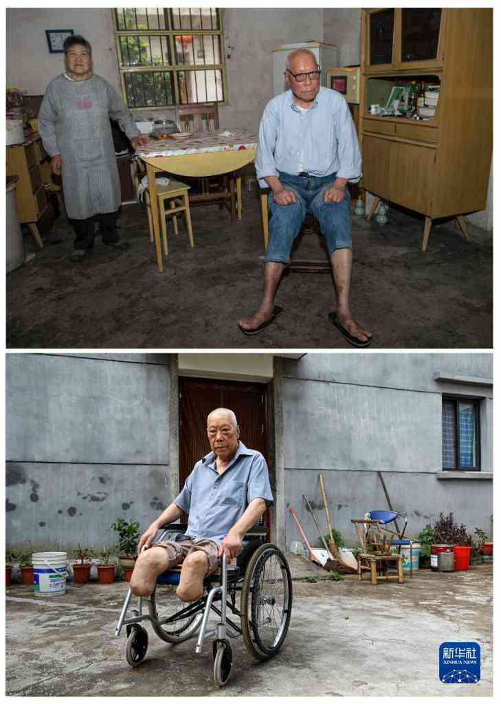 拼版照片:上圖為2015年4月29日,張寶善在衢州市柯城區(qū)花園街道東周村家中(新華社記者韓傳號(hào)攝);下圖為2021年9月3日,截肢后的張寶善在家中留影(韓強(qiáng) 攝)。