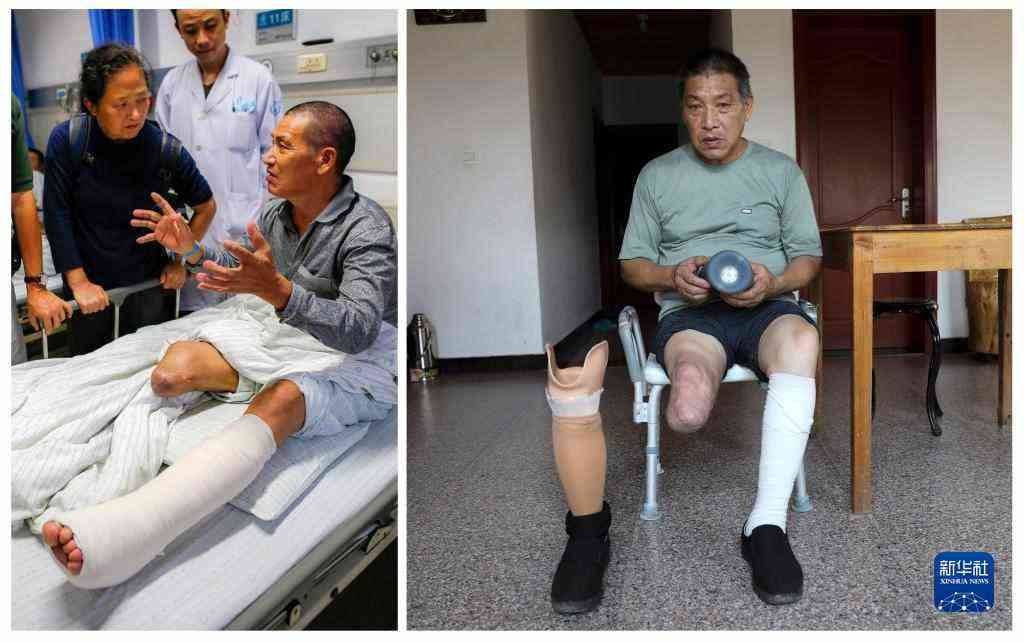 拼版照片:左圖為2016年10月24日,姜水根在醫(yī)院接受截肢手術(shù)后與探望人員交談;右圖為2021年9月3日,姜水根在衢州江山市大陳鄉(xiāng)大陳村家中脫下假肢。