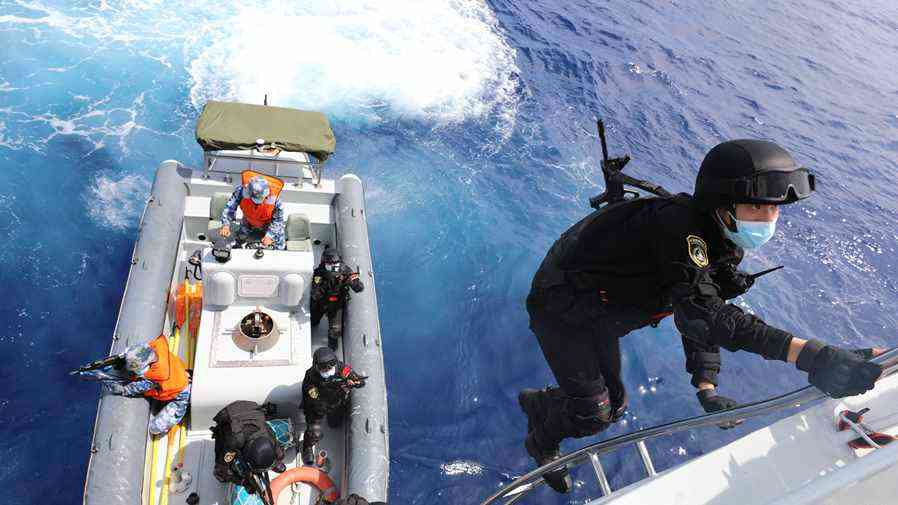 中國海軍第38批護航編隊南京艦組織隨艦陸戰(zhàn)隊員開展艦舷攀爬訓(xùn)練(5月20日攝)。新華社發(fā)(王宗洋 攝)