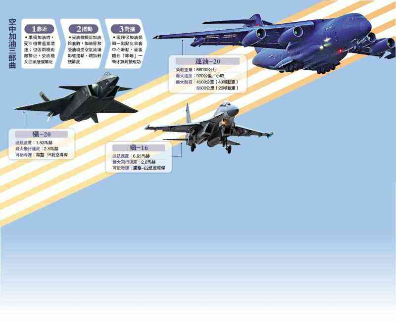 國產(chǎn)大型加油機(jī)──運(yùn)油-20日前首次亮相臺(tái)海。運(yùn)油-20以運(yùn)-20“鯤鵬”大型遠(yuǎn)程運(yùn)輸機(jī)為平臺(tái)改裝而成。在11月28日的臺(tái)海巡航中,1架運(yùn)油-20與2架殲-16同組行動(dòng)。運(yùn)油-20可供輸油量超過60噸,能為殲擊機(jī)提供充足的燃料。作為空中戰(zhàn)略保障的重要裝備,運(yùn)油-20可大幅提高轟炸機(jī)、殲擊機(jī)等軍機(jī)的遠(yuǎn)程作戰(zhàn)能力,擴(kuò)大打擊范圍。軍事專家杜文龍認(rèn)為,有了運(yùn)油-20,解放軍戰(zhàn)機(jī)就可以“跑馬拉松”,在臺(tái)海周邊以及其他熱點(diǎn)地區(qū)的威懾功能也將大幅上升。