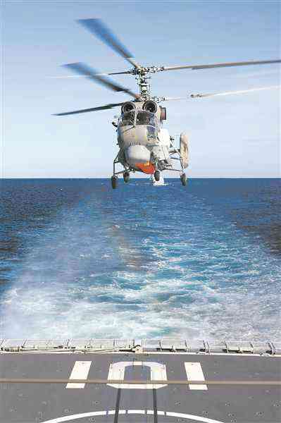 俄方艦載直升機(jī)飛臨中方艦艇進(jìn)行模擬著艦演練。