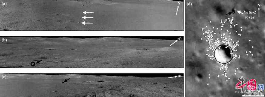 圖 4 (a)、(b)和(c) “玉兔二號”月球在第13、14和15月晝獲取的全景影像鑲嵌圖。(d)撞擊坑周圍的石塊空間分布