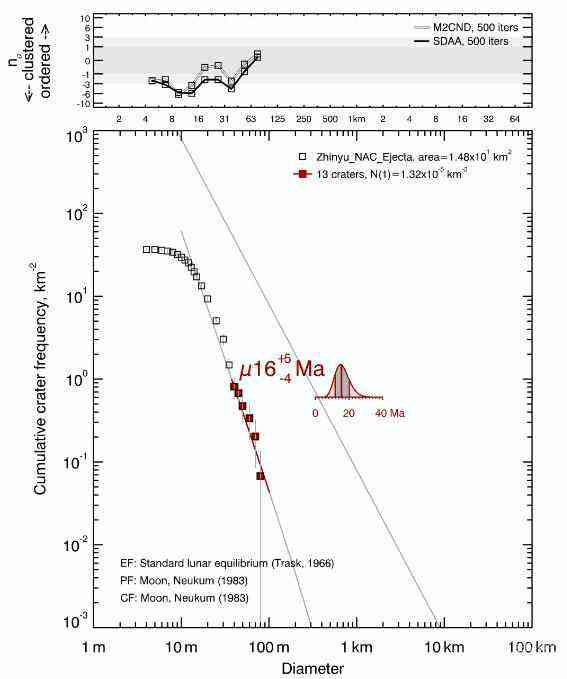 基于以上分析,本研究認為“玉兔二號”月球車觀察到的石塊實際源自古老的芬森撞擊坑,它們原本埋藏在著陸區(qū)月壤之中,后期由于織女撞擊坑濺射物的撞擊挖掘作用而暴露在月表??椗矒艨拥亩杲Y(jié)果揭示這些石塊已在月表存在了大約1600萬年(圖 6)。