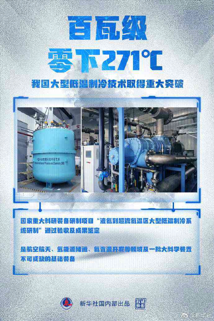 近日,國(guó)家重大科研裝備研制項(xiàng)目“液氦到超流氦溫區(qū)大型低溫制冷系統(tǒng)研制”通過驗(yàn)收及成果鑒定,標(biāo)志著我國(guó)具備了研制液氦溫度(零下269攝氏度)千瓦級(jí)和超流氦溫度(零下271攝氏度)百瓦級(jí)大型低溫制冷裝備的能力。