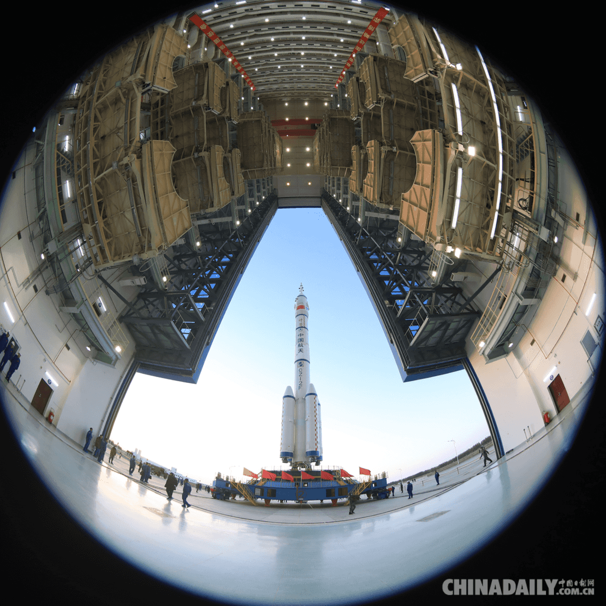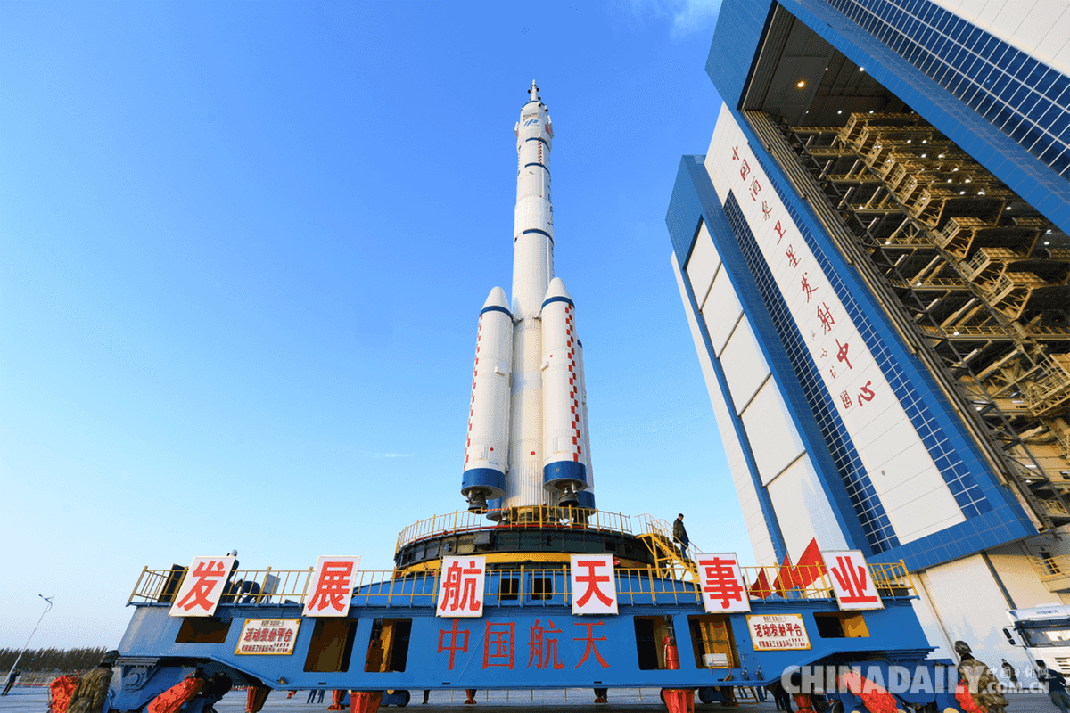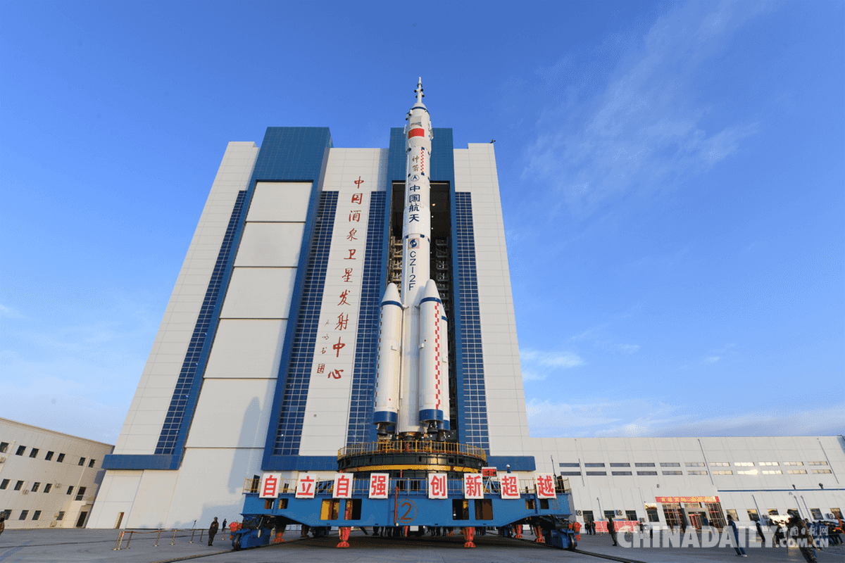 10月7日,神舟十三號(hào)載人飛船與長(zhǎng)征二號(hào)F遙十三運(yùn)載火箭組合體從測(cè)試廠房出發(fā),轉(zhuǎn)運(yùn)前往發(fā)射塔架。汪江波攝