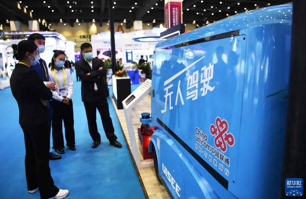 10月10日,觀眾在北斗融合應(yīng)用成果博覽會(huì)上參觀一款無人駕駛運(yùn)輸車。