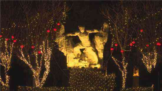 進入公園,發(fā)光燈懸掛在石橋上,一大串燈燈籠橫跨左右,這樣的燈景同樣有趣。東風公園標志性的雕塑名為《劈山引水》,在燈光影映下,石雕人物更顯魅力。很多樹木上,橘黃色的發(fā)光燈泡和紅色的燈籠交織在一起很是好看。