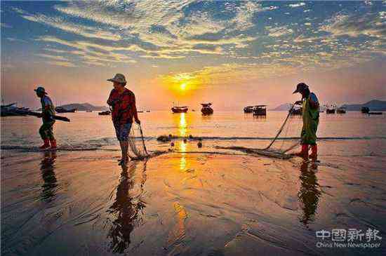 黎明,灘涂始而銀光閃閃,繼而金黃耀眼,黃金般的海浪輕緩地涌向港灣,涌向?yàn)┩?,擱淺的小船,靈動(dòng)的水線,別致的圍網(wǎng),飛來的白鷺,趕海的漁民,一一出現(xiàn)。