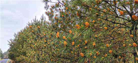 仲春時節(jié),在省道漁瑤公路右龍嶺沿途,松樹周身散發(fā)出光亮的新綠,沐浴著春風和暖陽,它們開始競相開花。