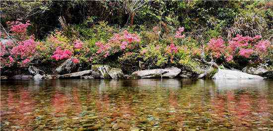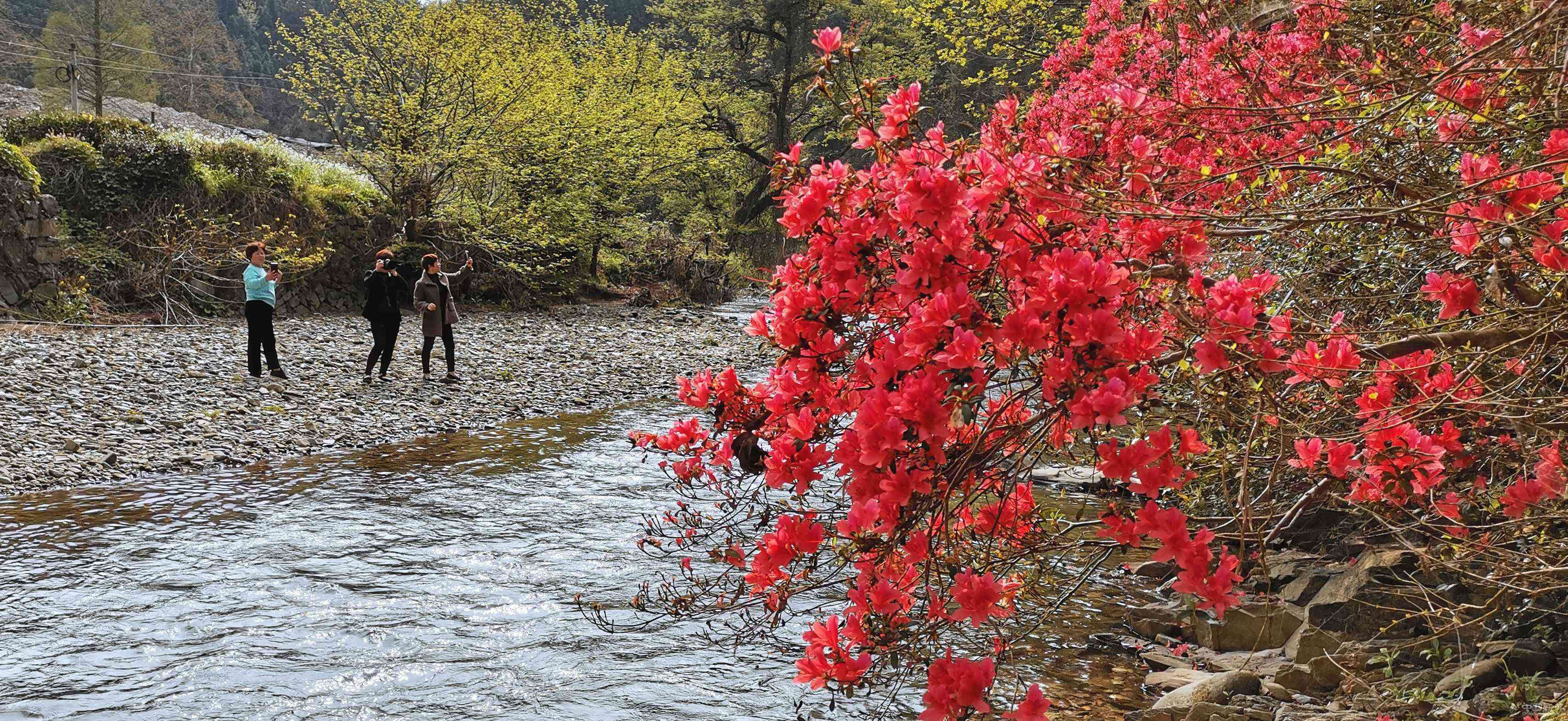 走進(jìn)鶴城鄉(xiāng),只見山林之間、公路沿線、溪流兩岸,到處盛開著野生的映山紅。嬌艷欲滴的花朵綴滿枝頭,一叢叢、一簇簇,燦若云霞,美如錦繡。沿河而開的映山紅,宛如給一溪碧水鑲嵌上了一條鮮紅的綢帶。美麗的花影倒映在清澈見底的溪水之中,隨著水波蕩漾,呈現(xiàn)出難以描摹的朦朧之美。嬌艷的映山紅,在綠樹、溪水、民居的映襯下,更是美不勝收,令人陶醉。