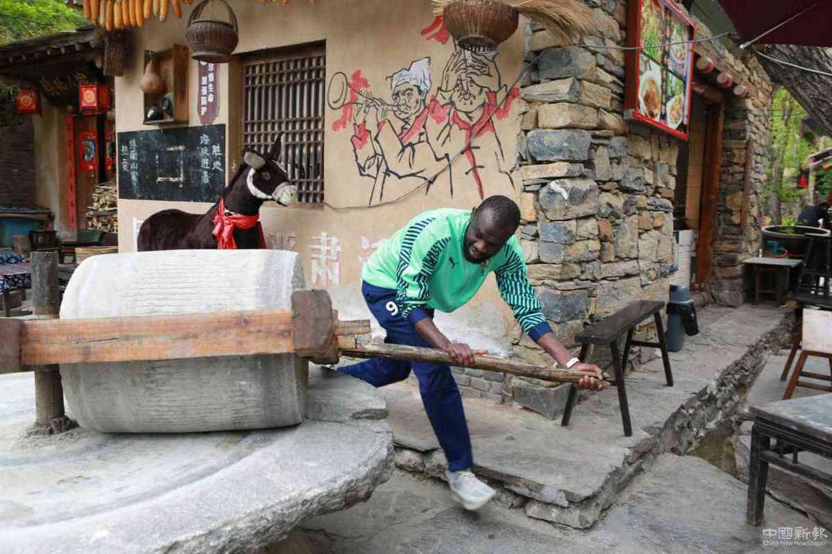 媒體團(tuán)成員在終南山寨中體驗(yàn)石磨