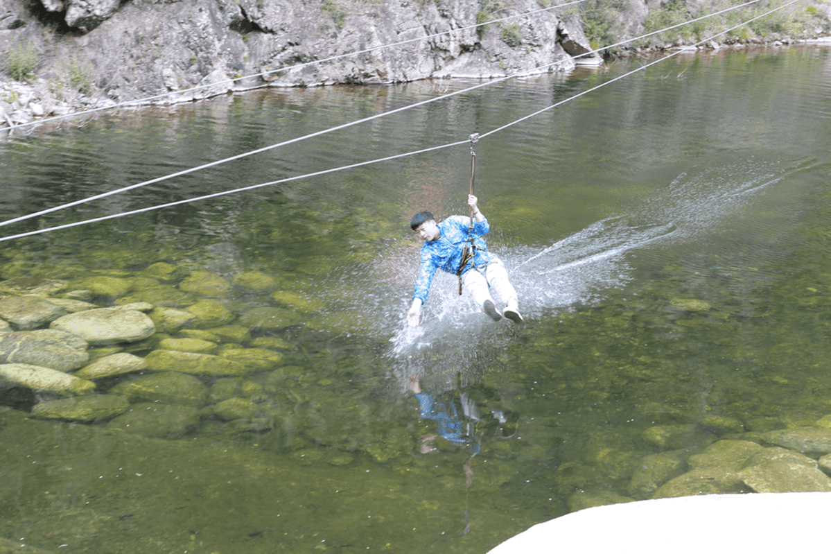 峽谷運(yùn)動(dòng)區(qū)域的工作人員向媒體團(tuán)展示刺激的水上項(xiàng)目。