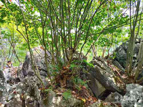 拐過幾道彎,我發(fā)現(xiàn)了一片楓樹林。應該是缺土少水的原因,這些楓樹長得并不高大,頂多兩米左右。它們雖也盤根石上但依然長得很旺盛,清風徐來,片片葉兒隨風起舞,像是在表達它們的歡迎致意。