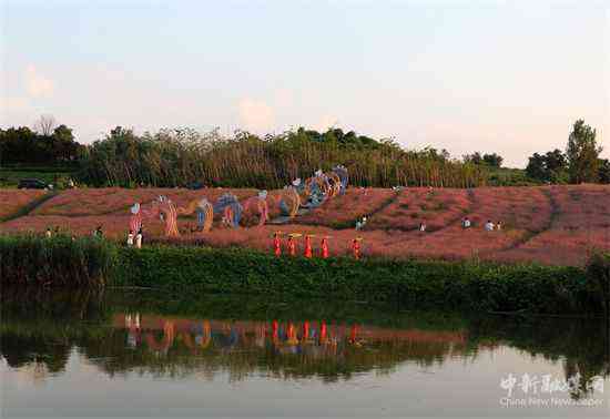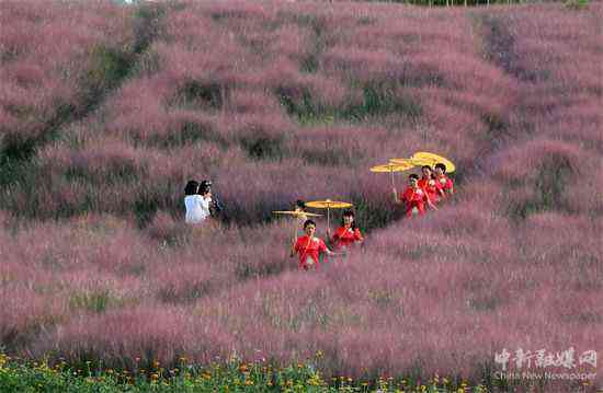 2021年9月12日,安徽省合肥市廬江縣湯池鎮(zhèn)舒廬干渠南側(cè)山坡,當(dāng)?shù)鼐用窈桶朔接慰鸵约捌炫圩咝汴?duì)伍在粉黛亂子草間賞花走秀、拍照留念。