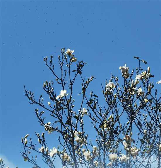 這棵望春花樹生長在一戶村民的屋后,樹高12米,為人工栽植,樹齡已有30年。往年這棵望春花樹大多是二三月開花,秋天開花很少見,即使開花,花朵數(shù)量也極其有限。今年卻一反往常,不僅在十月開花,而且花開茂密。潔白素雅的望春花綴滿枝頭,香氣四溢,形成一道秋天里難得一見的美景,令當(dāng)?shù)卮迕窈屯獾赜慰腕@奇不已。他們紛紛拍照,將這滿樹的繁花定格在鏡頭里,并通過微信與親朋好友分享。 (盛紅兵 宋建忠 方婧)
