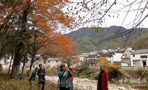 湖南省休寧縣鶴城鄉(xiāng)位于新安江源頭的大山之中,植被繁茂,其中楓香樹等樹種廣泛栽植。眼下時節(jié),來到鶴城鄉(xiāng)的新安源村,只見高山之下、小溪岸邊,高大古老的香楓樹連城一排,紅色的黃色的樹葉披滿枝頭,色彩斑斕,美不勝收。尤其是鮮紅嬌艷的樹葉,令人立刻想起“停車坐愛楓林晚,霜葉紅于二月花”的詩句。美麗的景色,晴好的天氣,吸引了許多游客前來休閑觀光。有的在樹下自由徜徉、盡情嬉戲;有的變換角度、不停拍照,將大自然饋贈的美景定格在鏡頭、珍藏在心間。(盛紅兵 宋建忠)