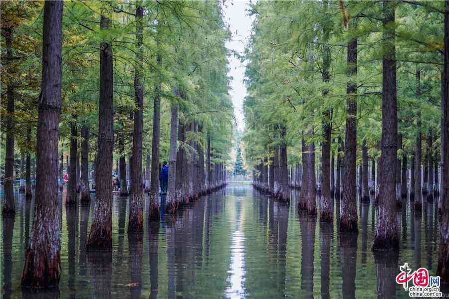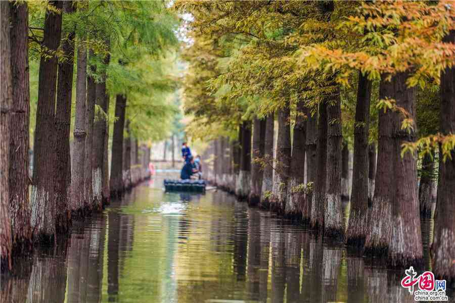 從島上回到岸邊,來到水上森林,筆直高大的水杉生長在淺水中,縱橫成巷,水光瀲滟,竹筏悠悠,水杉林正在進(jìn)行夏秋的交替,黃綠浸染,秋色在漫延。