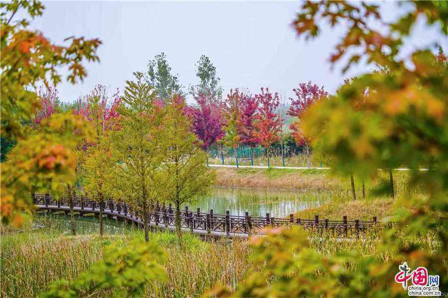 水杉林對面是鹿園,園門將濕地最濃艷的一抹秋色“鎖住”,園里種植的美國楓葉以及其他彩林樹種,紅黃橙綠五彩點(diǎn)綴亭子與木棧道,雖是沒看見鹿,但收獲了最艷麗的濕地之秋。