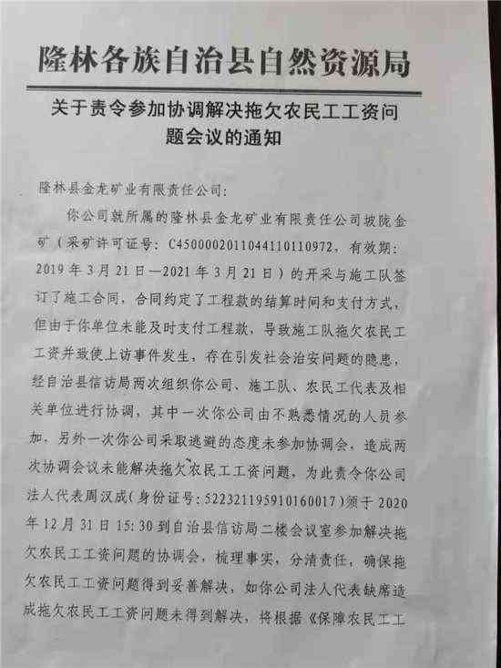 在一份2020年12月30日的隆林縣各族自治縣自然資源就《關(guān)于責(zé)令參加協(xié)調(diào)解決拖欠農(nóng)民工工資問題會議的通知》顯示,隆林縣金龍礦業(yè)有限責(zé)任公司坡攏金礦未能及時(shí)支付工程款,導(dǎo)致施工隊(duì)拖欠農(nóng)民工工資,致使農(nóng)民工上訪,存在引發(fā)社會治安問題的隱患。