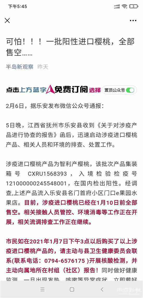 中國新報湖南訊 (記者 陳斌)2月6日,據(jù)樂安發(fā)布微信公眾號通報:5日晚,江 西省撫州市樂安縣收到《關(guān)于對涉疫產(chǎn)品進行協(xié)查的報告》函后,迅速啟動涉疫 進口櫻桃產(chǎn)品、相關(guān)人員和環(huán)境的排查、處置工作。