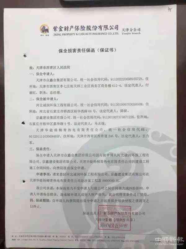 據(jù)了解,2019年5月10日,根據(jù)紫金財產(chǎn)保險股份有限公司天津分公司出具的《保全損害責任保函(保證書)》,眾鑫合公司申請法院將誠潤環(huán)保在楊柳青電廠的剩余工程款880萬元悉數(shù)凍結(jié)查封。