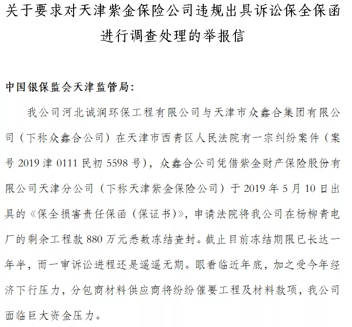 為此,誠潤環(huán)保公司又于2020年12月向中國銀保監(jiān)會進行了實名舉報,請求依法調(diào)查天津紫金保險公司的承保流程是否合規(guī),依法調(diào)查承保流程,撤銷該保函,追究天津銀保監(jiān)局的監(jiān)管責任,并對資金扣押造成的損失給予賠償。
