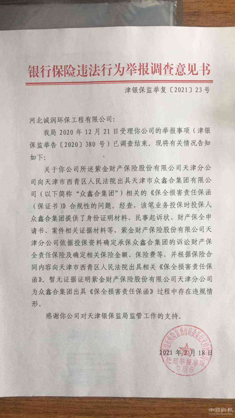 誠潤環(huán)保向銀保監(jiān)局舉報紫金保險違規(guī)出具保函。